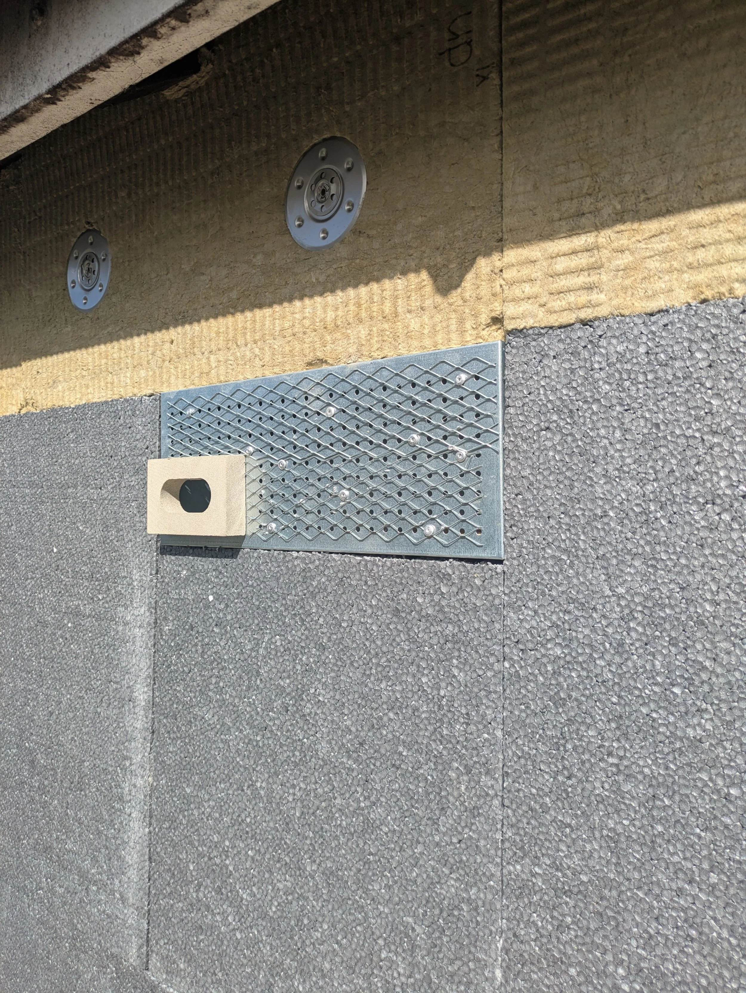 The EWI S Brick has lugs on each side with which to attach it to the underlying masonry. EWI is then fitted around it and the final facing render applied over the top, leaving the concrete entrance piece flush with the external surface.