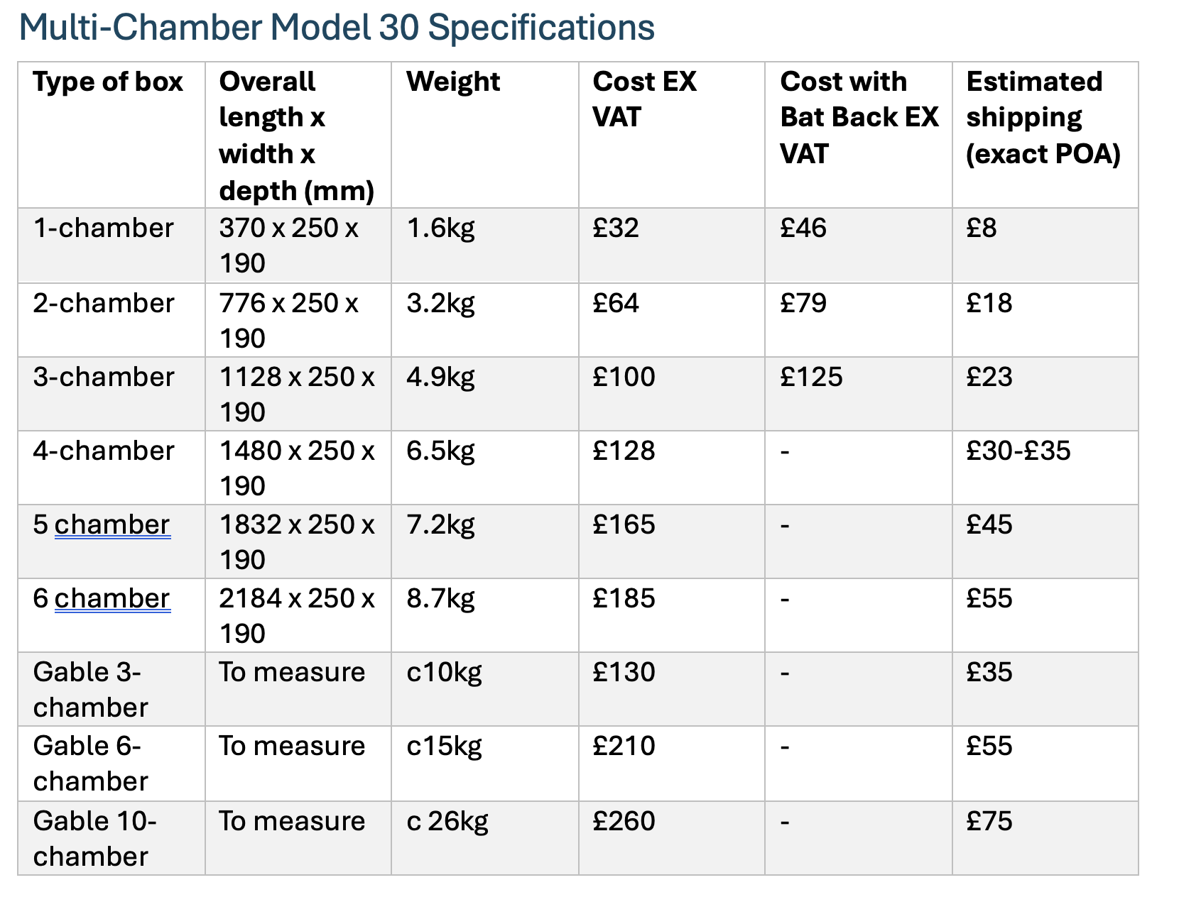 Model 30’s can also be produced to order with either 2, 3, 4 or 5 chambers (3 week lead time). Prices, weights and dimensions can be seen below. This is a sleek and easy way to provide a larger number of nest sites.
